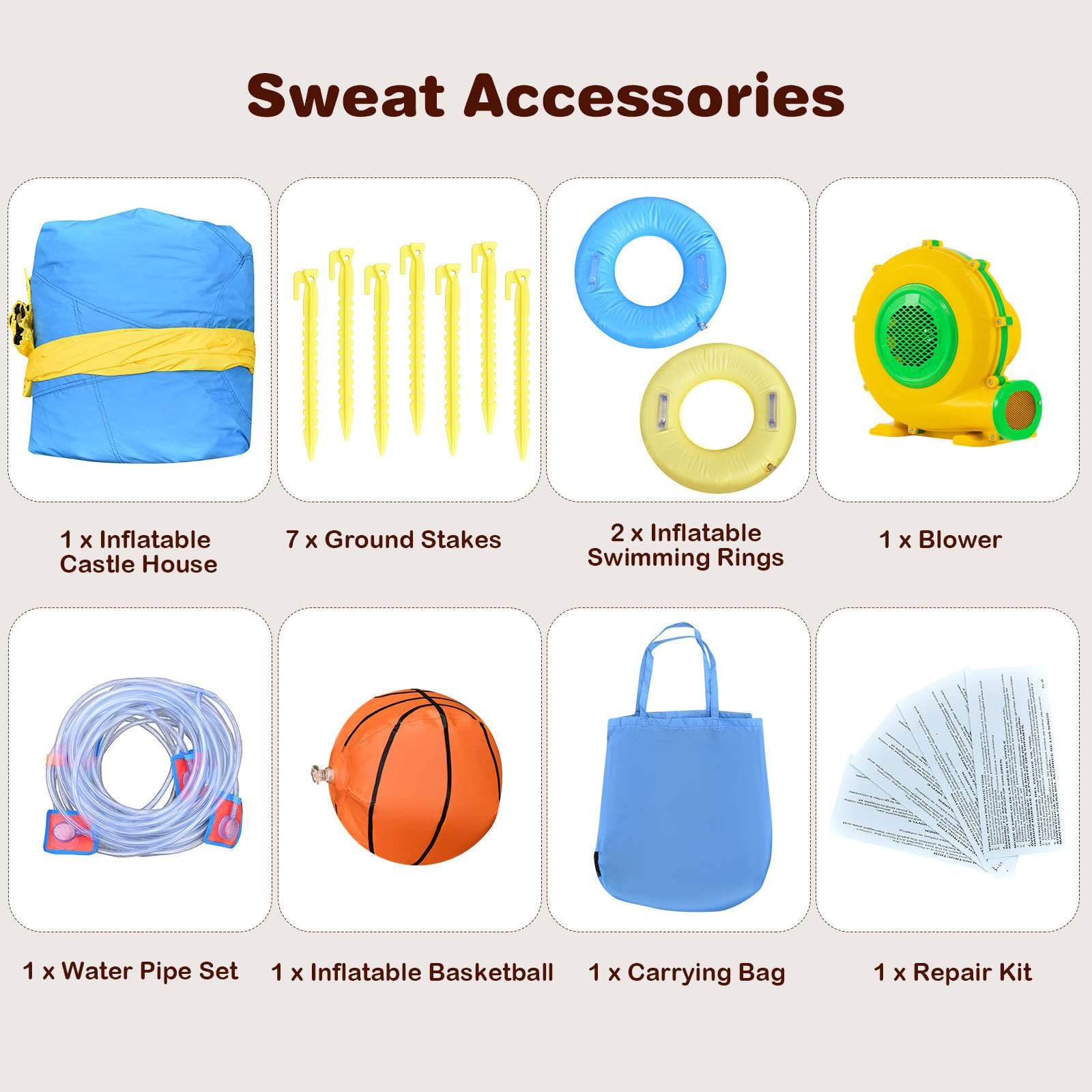 Sweet Accessories: The package includes 7 bouncer stakes, 1 basketball, 2 swimming rings, 1 hose, 1 repair kit, and 1 carrying bag. You can firmly secure the water slide park to the ground with stakes. A pack of repair kit is prepared for any uncertain damage. (Note: suitable for 3 children aged 3 - 10 years old to play together, total weight capacity of the inflatable part: 350 lbs, individual weight limit: 117 lbs)