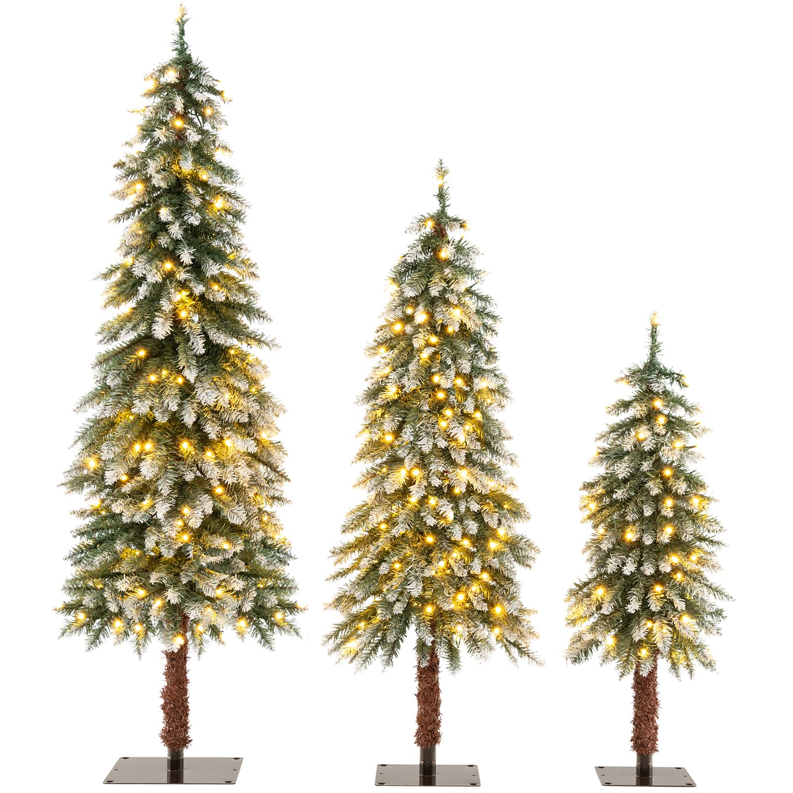 It contains 3 Christmas trees of varying sizes (90cm/120cm/150cm tall). Unleash your creativity as you embark on a journey of decorative exploration, combining these slim & versatile trees to breathe life & renewal into any space. Its special snowy leaves will transport you back to cherished holiday memories of the winter. With 129/ 231/ 369 branch tips & realistic trunks, each tree encapsulates the essence of nature, offering an enchanting & lifelike ambiance. Watch as the 50/ 100/ 150 energy-saving LED lights dance, bathing your surroundings in a warm & enchanting glow. These trees boast high-quality PVC material that is fireproof, non-allergic & non-fading. The square metal stand ensures unwavering stability. By the way, the Xmas tree set needs the effortless installation. Embrace the holiday spirit with 2