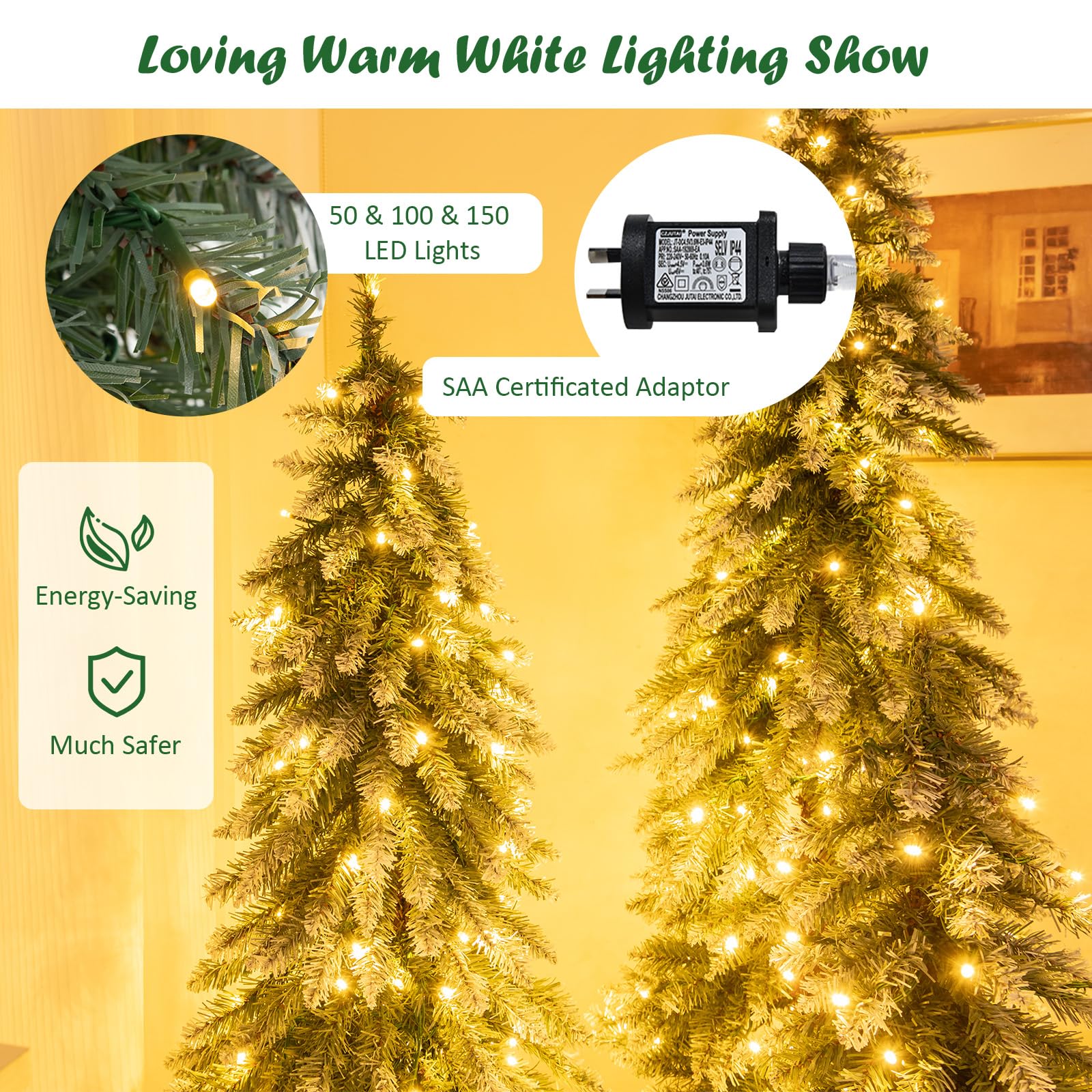 Eye-Catching Lighting: The Christmas tree set features energy-saving LED lights (50/ 100/ 150) to fill your space with warm white glow. Also, it has the SAA certificated adaptor to ensure a loving & magical ambiance with high security.