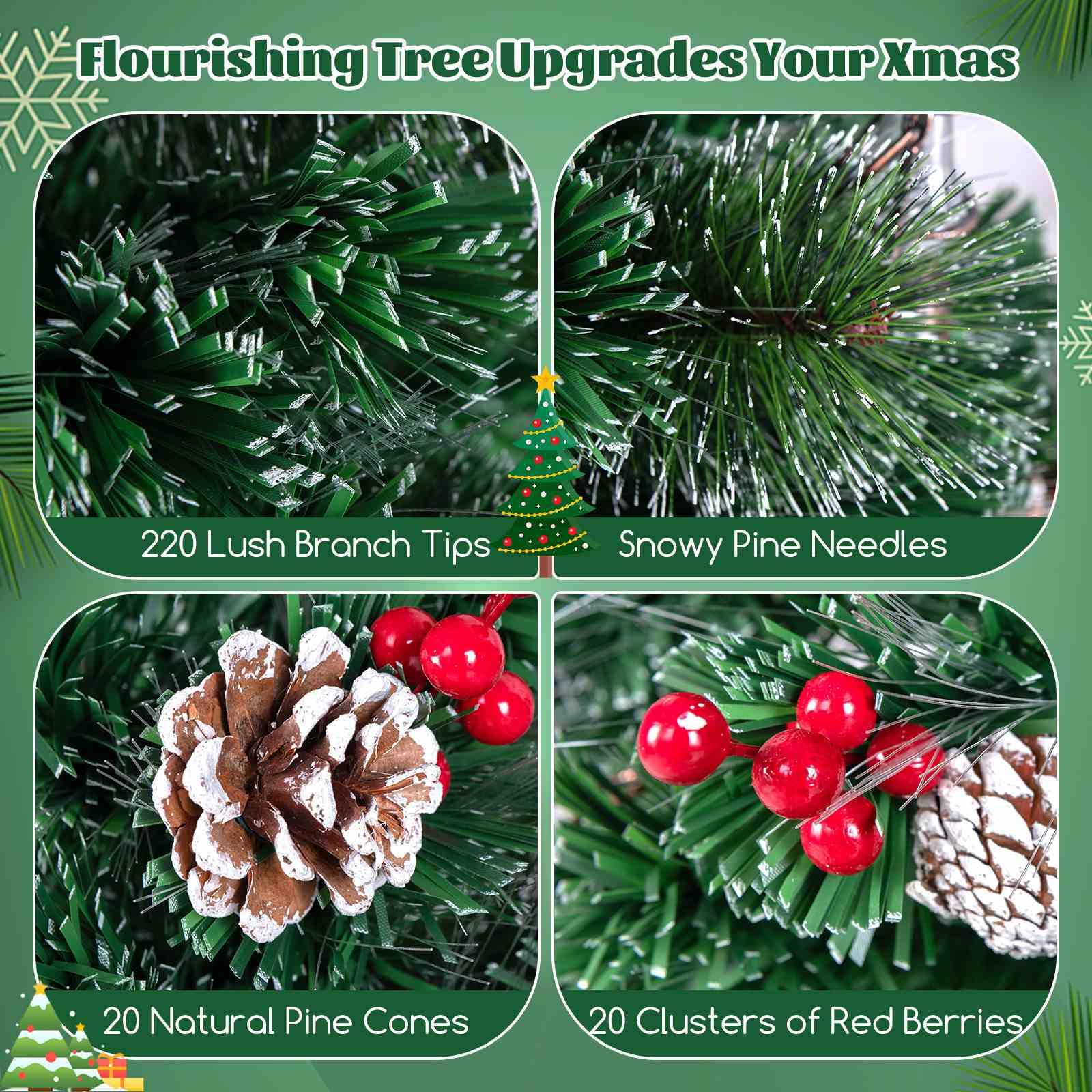 Lifelike Design: The 180CM Christmas tree captivates with 220 lush branch tips dusted in snowy pine needles, adorned with 20 natural pine cones and 20 clusters of red berries. The tree presents a festive flourish that brings the warmth of winter.