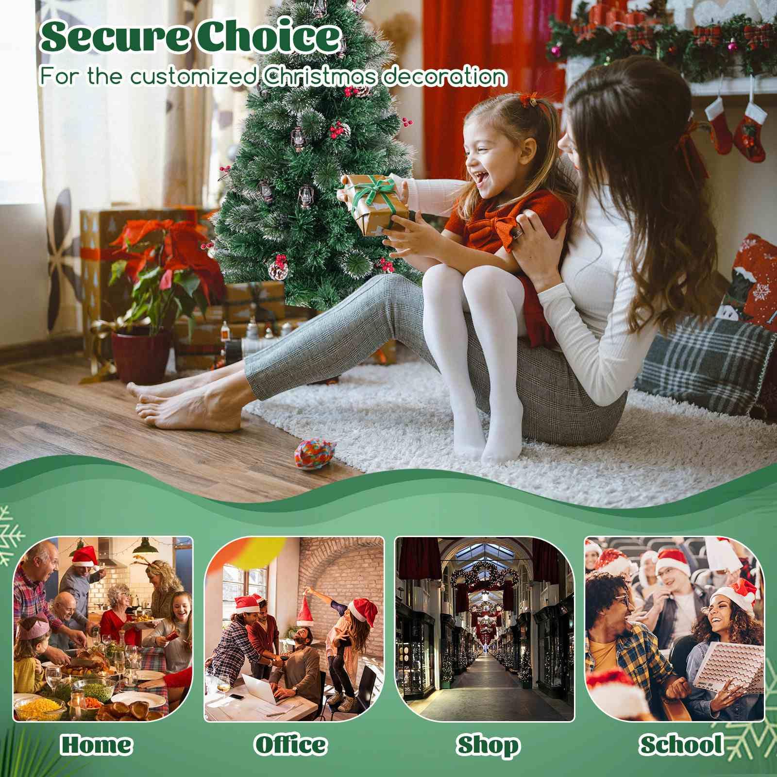 Beautiful Lighting Display: Illuminate your holidays with 64 warm white LED lights evenly distributed among the treetop star and 30 antique kerosene lamps. Besides, the Xmas tree also offers the attractive sparkle of charming optical fibers.