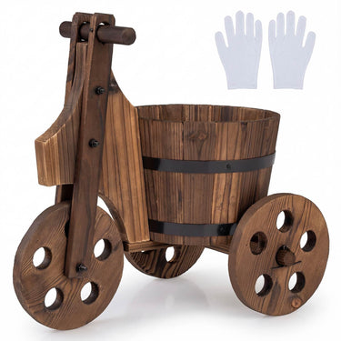 Inspired by classic farmhouse aesthetics, the antique finish and natural wood fragrance of the barrel flower pot effortlessly enrich your garden or patio ambiance. The premium wood construction is treated with carbonation, promising long-lasting strength and rustic beauty. The eye-catching tricycle design sets this planter apart, turning it into a statement piece ideal for showcasing vibrant flowers, fresh herbs, or decorative arrangements throughout the year. An integrated drainage hole at the base will encourage healthy plant growth by preventing water accumulation. Plus, thoughtful features such as a sturdy handle, robust metal band, and well-balanced 3-wheel construction ensure both stability and stylish presentation wherever you choose to place it.