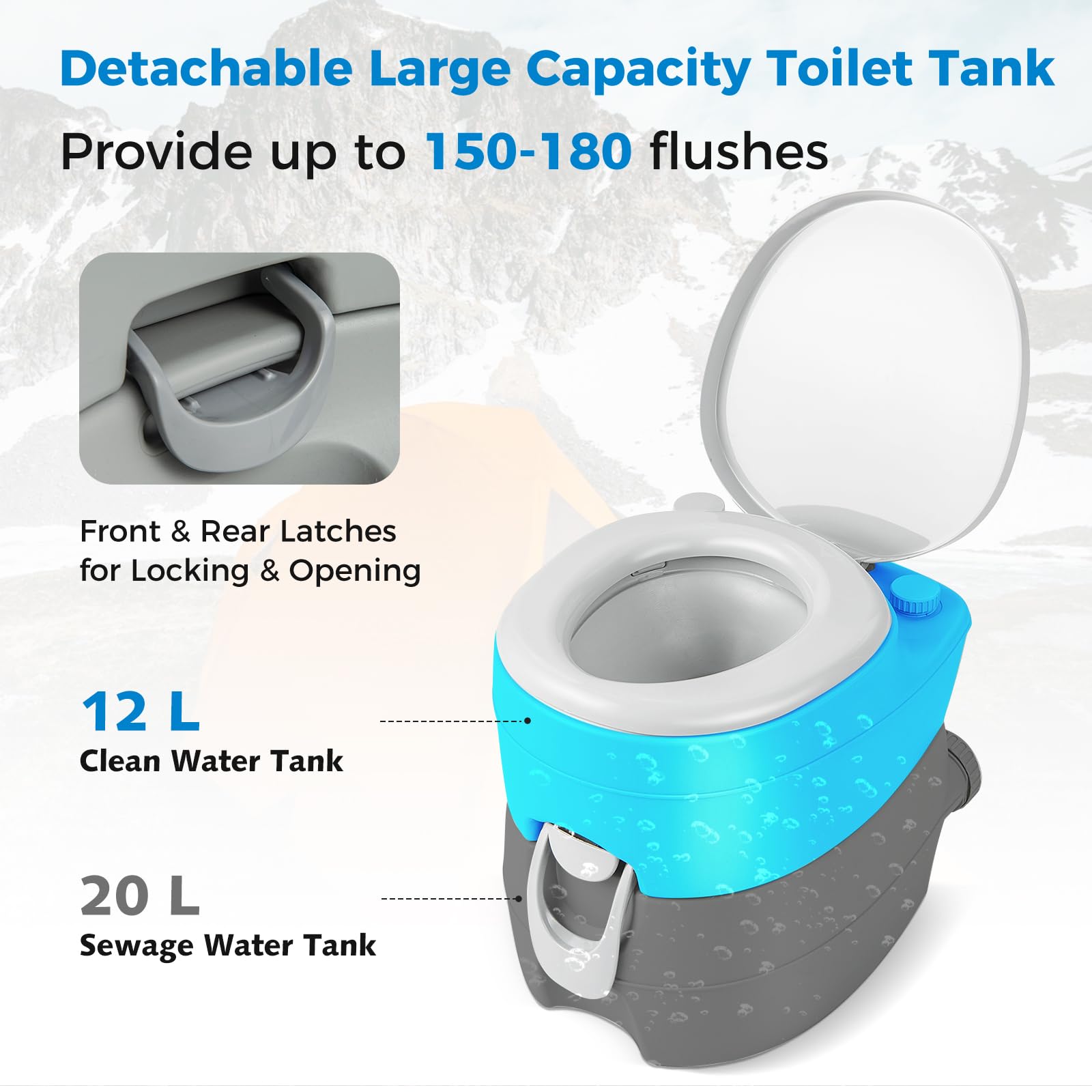 Generous Capacity for Extended Use: With a 12 L clean water tank and a 20 L sewage water tank, the camping portable toilet, allowing for up to 150-180 rinses on long-distance trips. With this large capacity, you can bid farewell to constantly refilling the tanks and enjoy a worry-free lavatory experience.