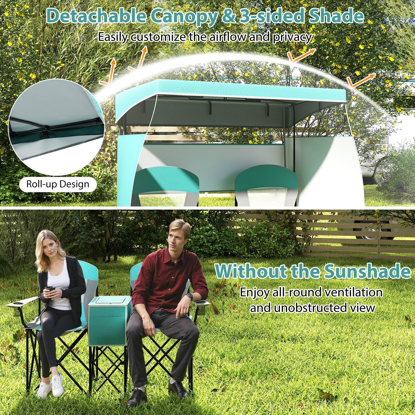 Adjustable Sunshade: This double beach chair features an adjustable canopy, crafted of premium polyester fabric with silver coating, offering excellent UPF50+ sun protection, while the tilting angle is adjustable, allowing you to block sunlight from all directions. Plus, the canopy is detachable for different needs.