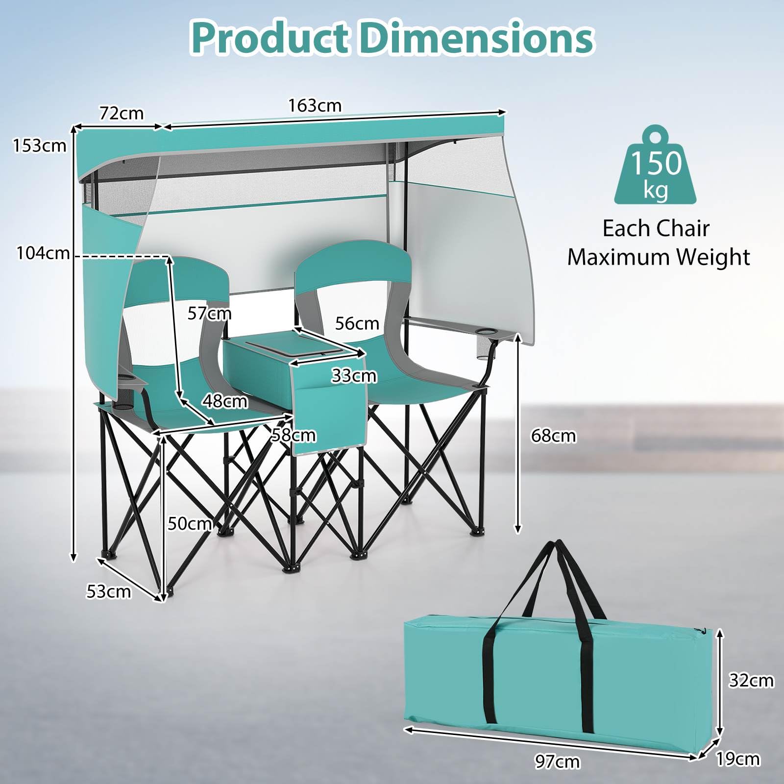 This double beach chair measures 163 x 72 x 153 cm (L x W x H) and comes with 2 spacious seats, ideal for enjoying outdoor leisure time with your beloved one. Moreover, it folds effortlessly and includes a portable carrying bag for convenient storage and transportation, thus you can easily carry it anywhere you want, from beaches to campsites and even sporting events. Designed to offer superior sun protection, our camping chair features a UPF50+ silver-coated canopy that can be adjusted to shield you from the sun's rays, complete with 2 side shades and a back flap for additional coverage. 3 shading curtains can be rolled up, while the canopy is detachable, meeting different needs. For enhanced reliability and stability, the chair is supported by a robust metal frame and crafted from a thickened oxford seat, complete with large footpads, preventing sliding or sinking into the soft ground. Added features such as the middle cooler bag keep your refreshments cold, while the integrated cup and phone holders ensure your essentials are always within easy reach.