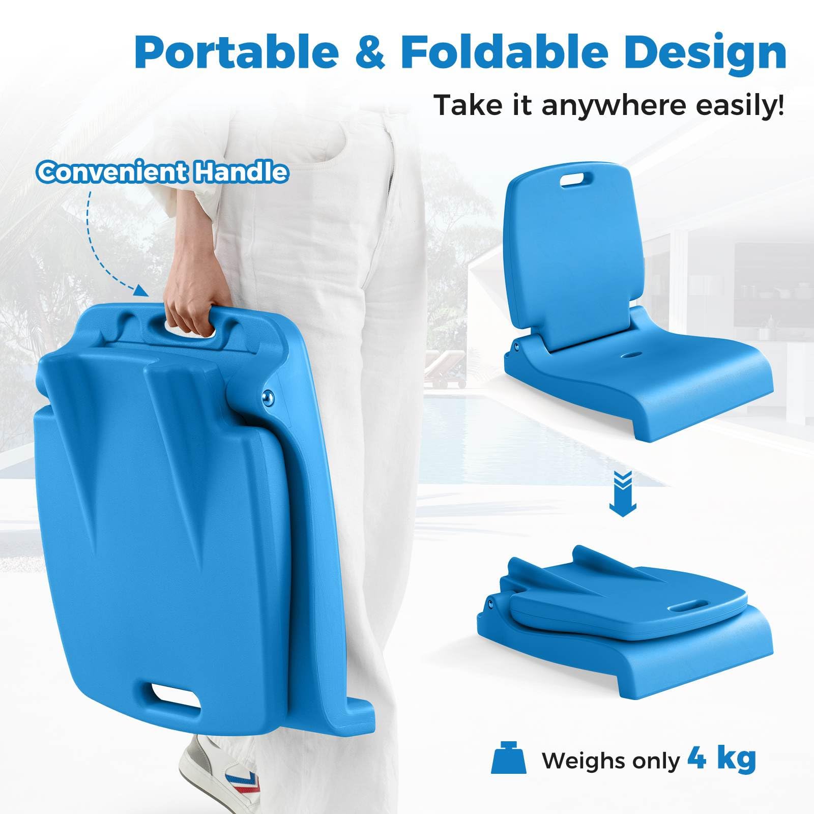 Made from high-quality PE material, this poolside chair is fade-resistant, waterproof, and easy to clean. The comfortable backrest with reinforced structure ensures excellent support for long periods of sitting. Besides, the lightweight chair can be folded into a compact size, fitting easily into your car trunk, and it also comes with a convenient handle for effortless carrying. This foldable chair includes practical drainage holes to prevent water accumulation and a built-in lip to keep it secure on pool edges or uneven ground. Whether you're by the pool, beach, boat, campsite, or picnic area, this versatile chair is what you want!