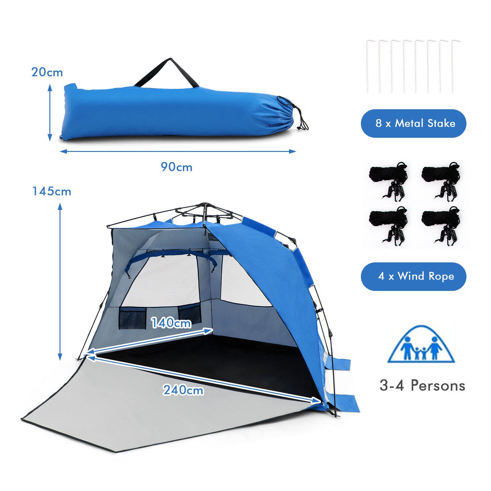 Roomy Space and Private Design: The portable beach tent measures 240 x 140 x 145 cm (L x W x H), providing a spacious interior shelter, which can accommodate 3-4 persons. Moreover, there exists an extended floor to expand the activity space. And the front porch can be zipped up, so the tent would be a private beach cabana.