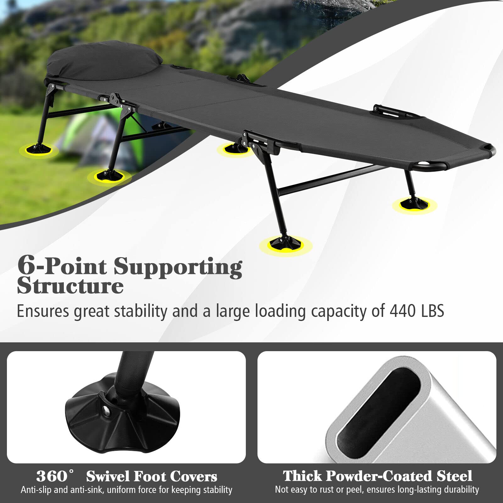 Sturdy & Sturdy Structure: The folding camping cot is constructed of thick powder-coated steel, which is not easy to rust, peel, or chip, ensuring long-lasting durability. And it features a 6-point supporting structure, ensuring great stability and a large loading capacity of 199.58kg.