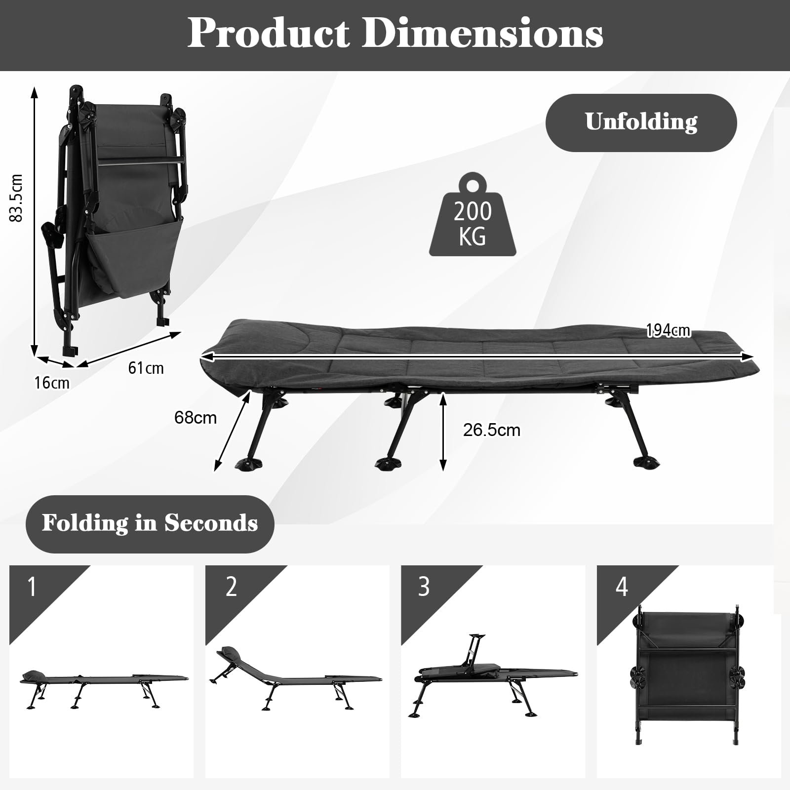 Enjoy a Comfortable Sleeping Experience Outdoors! Our folding camping cot measures 194 x 64 x 29 cm (L x W x H) (L x W x H) and weighs 6.35kg, which is perfect for your outdoor activities. Whether taking a nap, enjoying sunbathing, taking out for travel, hospital escorts, or office breaking, it can all satisfy your needs on different occasions. And the backrest can be adjusted in 6 positions for you to choose from. It is made of durable oxford fabric and anti-rust powder-coated steel, which is high-strength, deformation-resistant, and durable. And the fabric is breathable to keep you feeling naturally cool in hot & wet seasons. Moreover, we also provide a soft padded mattress that allows you to enjoy superior relaxation and comfort in cold seasons. Thanks to the stable 6 supporting legs and large foot covers, the camping cot would not wobble when used outdoors, and the foot covers can be rotated 360° for increasing stability. Besides, the travel cot can be folded into a compact size in seconds, and then you can store it in the car trunk for easy transportation.