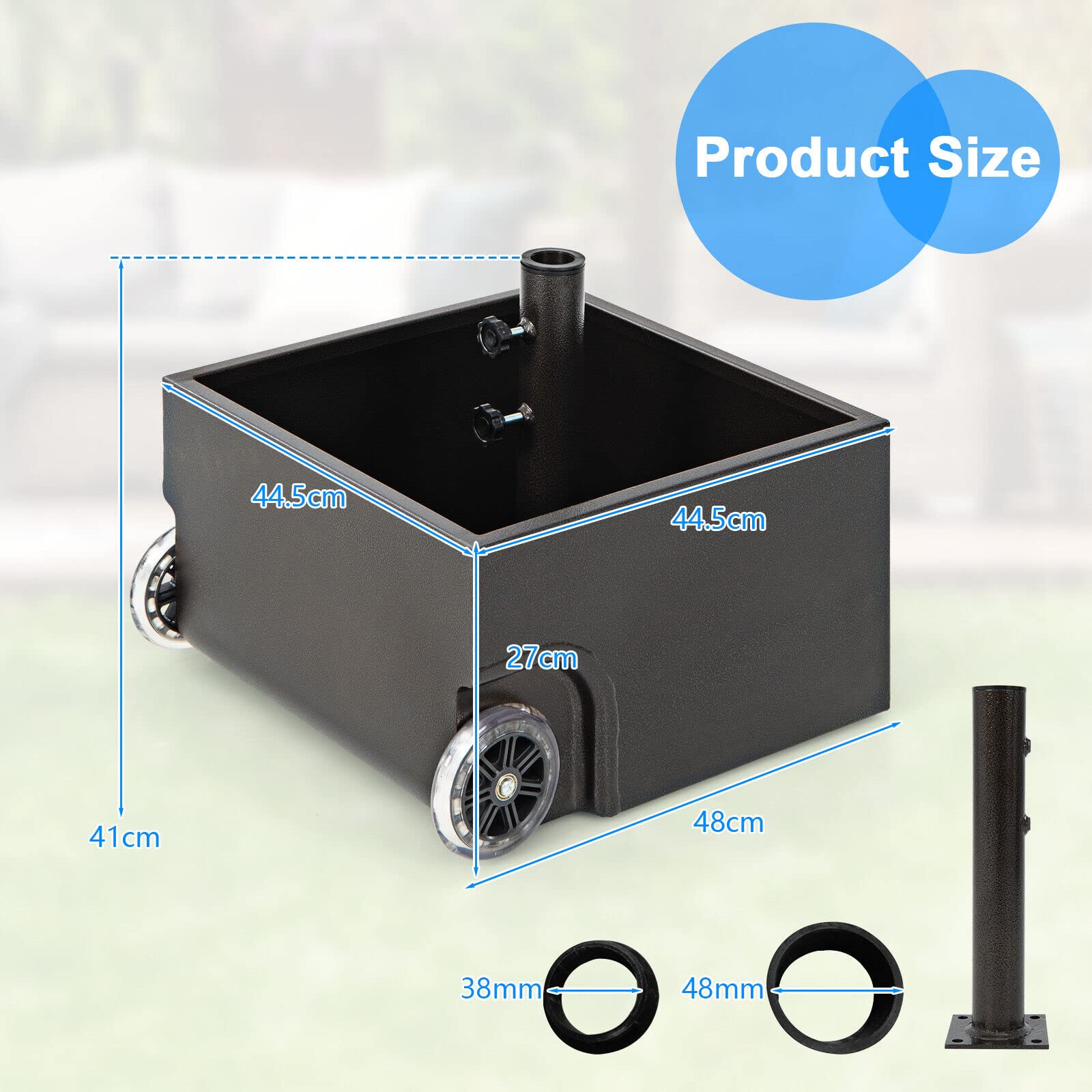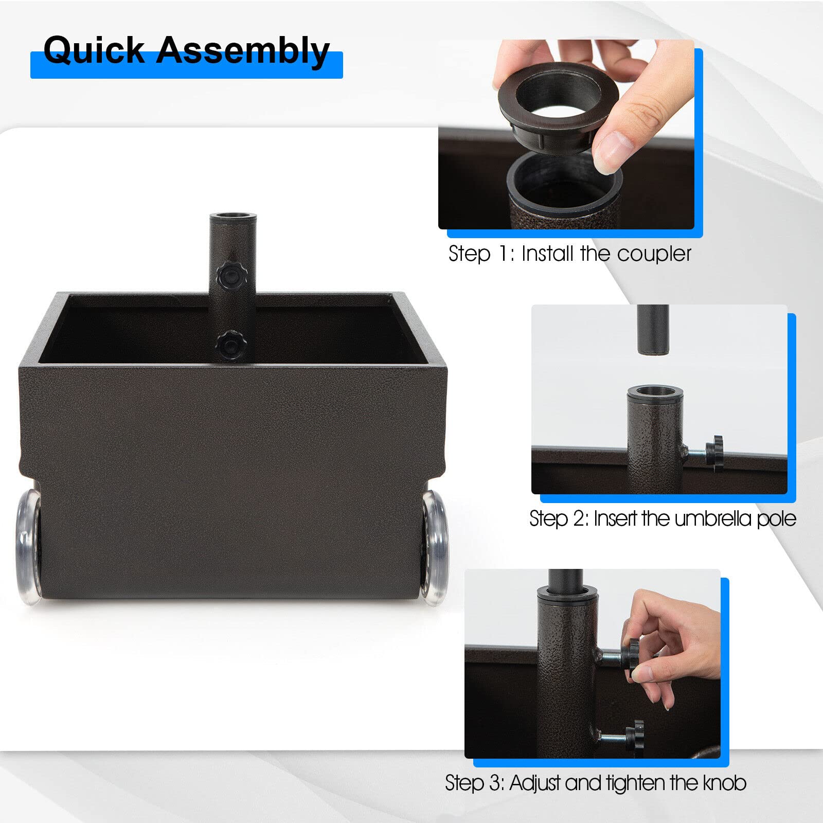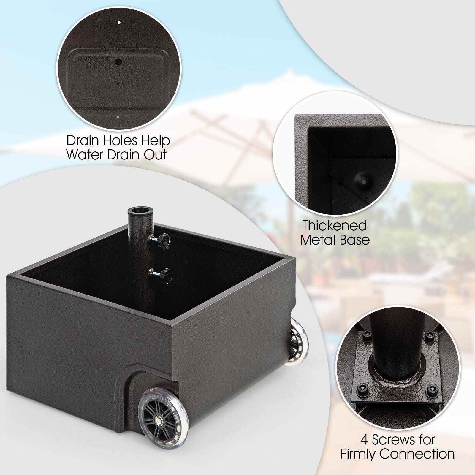 Great Helper for Providing Shade Outdoors! Our 68kg patio market umbrella stand is compatible with multiple types of umbrellas and spaces, and you can use it for outdoor dining at the patio table, by the pool, on the patio, or anywhere you want to enjoy outdoor leisure time. You can use the 2 adjustable tightening knobs to secure the umbrella pole preventing it from wobbling or falling. More than that, the square metal umbrella base can also be used as a rolling planter stand, allowing you to put your favorite plants in it for viewing. And it features 2 large wheels for easy movement. Besides, the umbrella base is made of high-strength powder-coated steel, which is sturdy, durable, and not easy to rust, peel, or chip, ensuring long service life. And it can hold up to 150 lbs of sand, allowing the umbrella base to remain upright and stable under windy conditions.