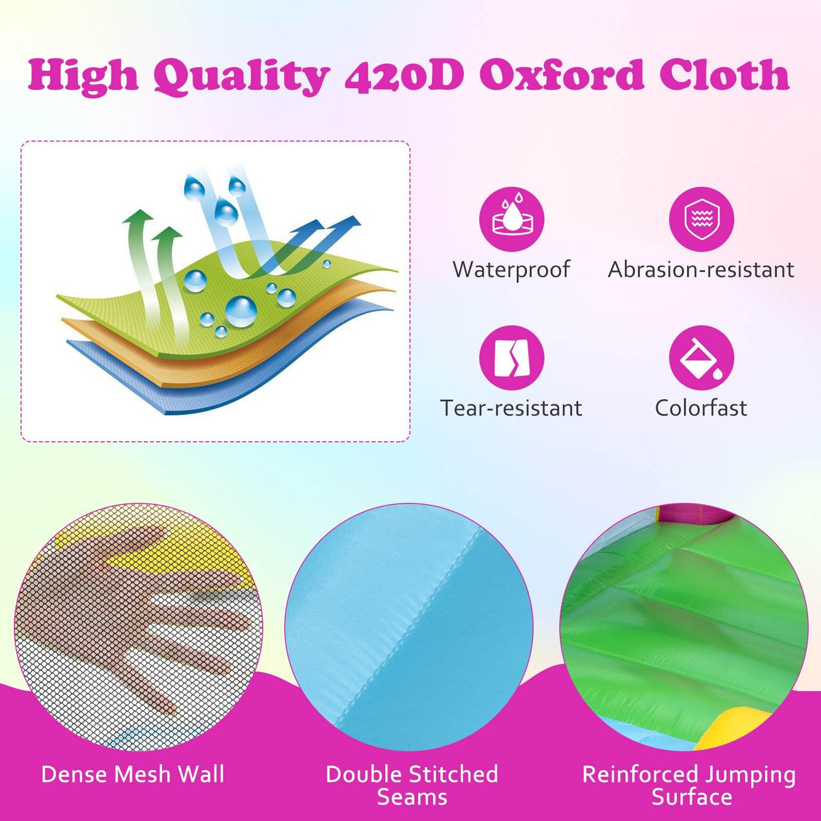 Let's party together! The combination of smooth slide and spacious jumping area provides endless entertainment. This inflatable bounce house is tear-resistant and tear-resistant with its premium Oxford cloth and double-stitched seams, ensuring long-lasting play. Together with mesh protective walls, higher security is ensured. Unfold the bounce house, connect to the blower and anchor it with ground stakes. Share great fun with friends whenever and wherever! The bounce house is perfect for both indoor and outdoor use.