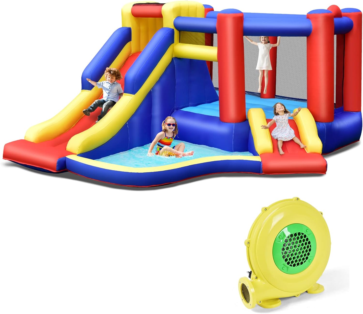 Start to Play in No Time: With the illustrated instructions and detailed guide, you can set up the bouncy castle in the backyard with ease. Just unfold the product and connect it with a recommended 480W blower (not included), the castle will be inflated in minutes. And remember to keep the blower running when kids are playing.