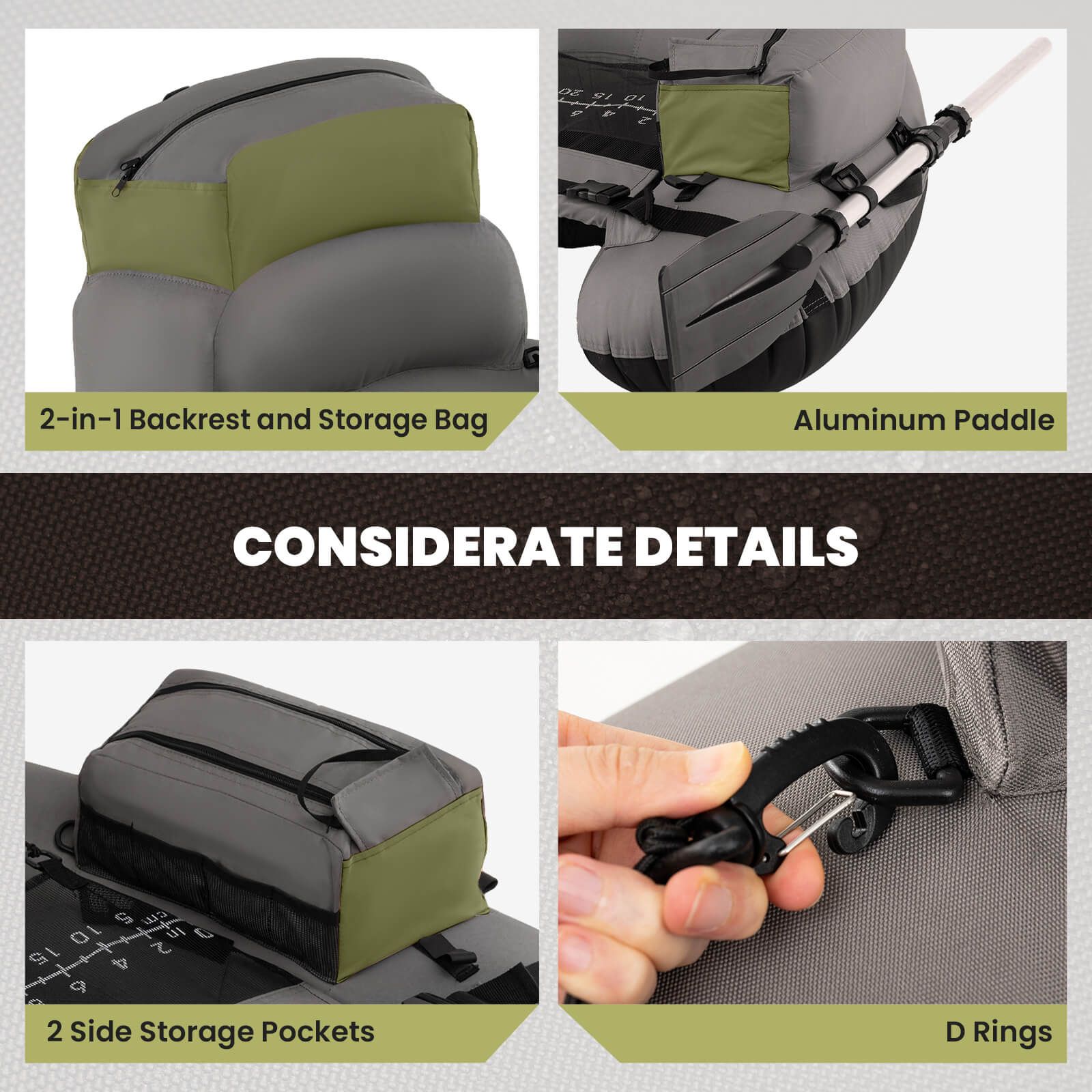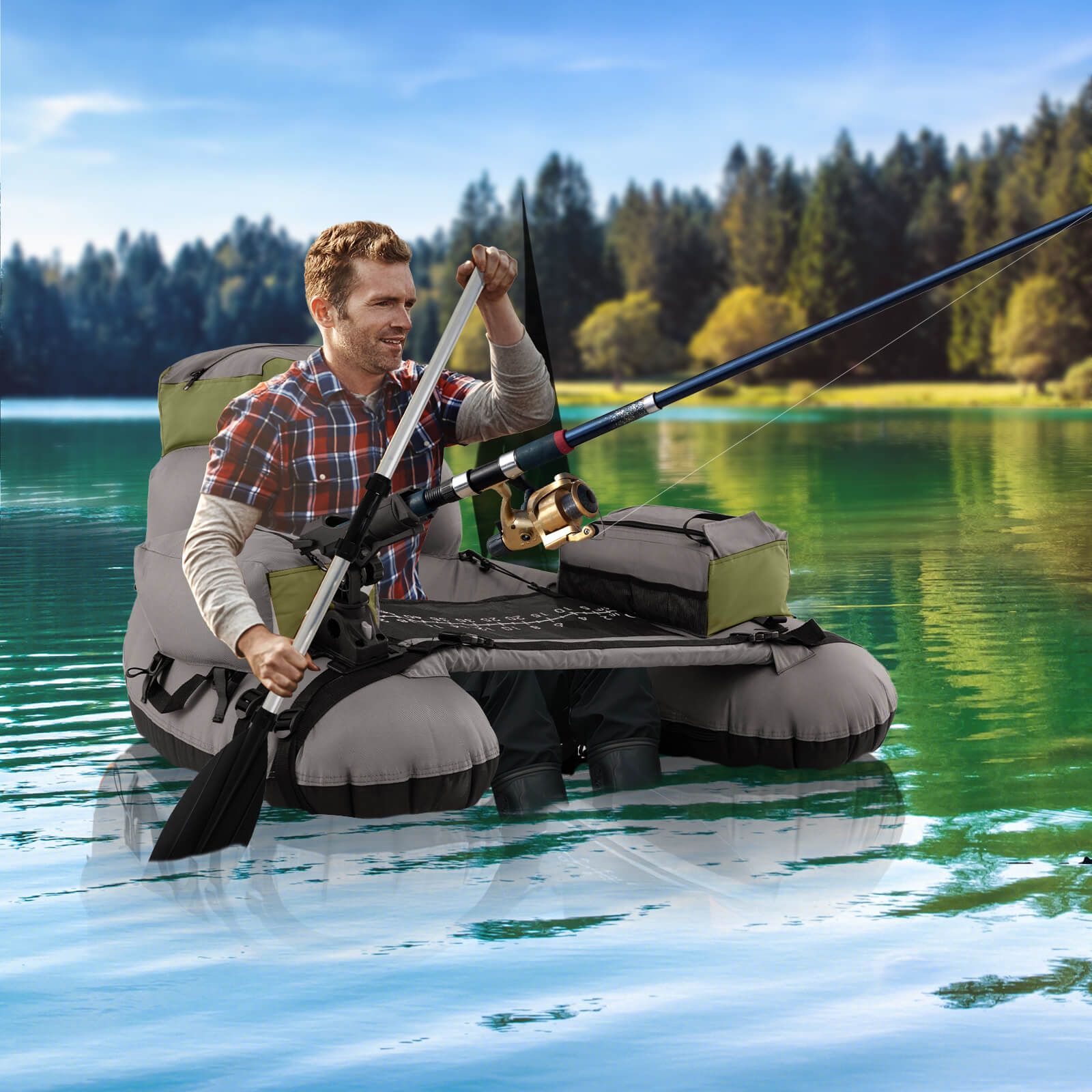 Considerate Details: The angling boat includes a detachable aluminum paddle for easy navigation, D rings for attaching gear, 2 flippers for mobility, a repair kit for unexpected punctures.