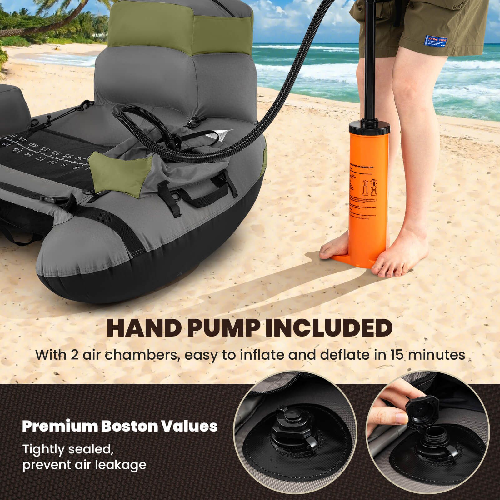 Efficient Inflation System: Designed for convenience, the tube features 2 separate air chambers that enable quick and easy inflation and deflation within 15 minutes. Included with a pump and premium Boston valves, it ensures a tight seal to prevent air leaks, allowing more time for fishing.