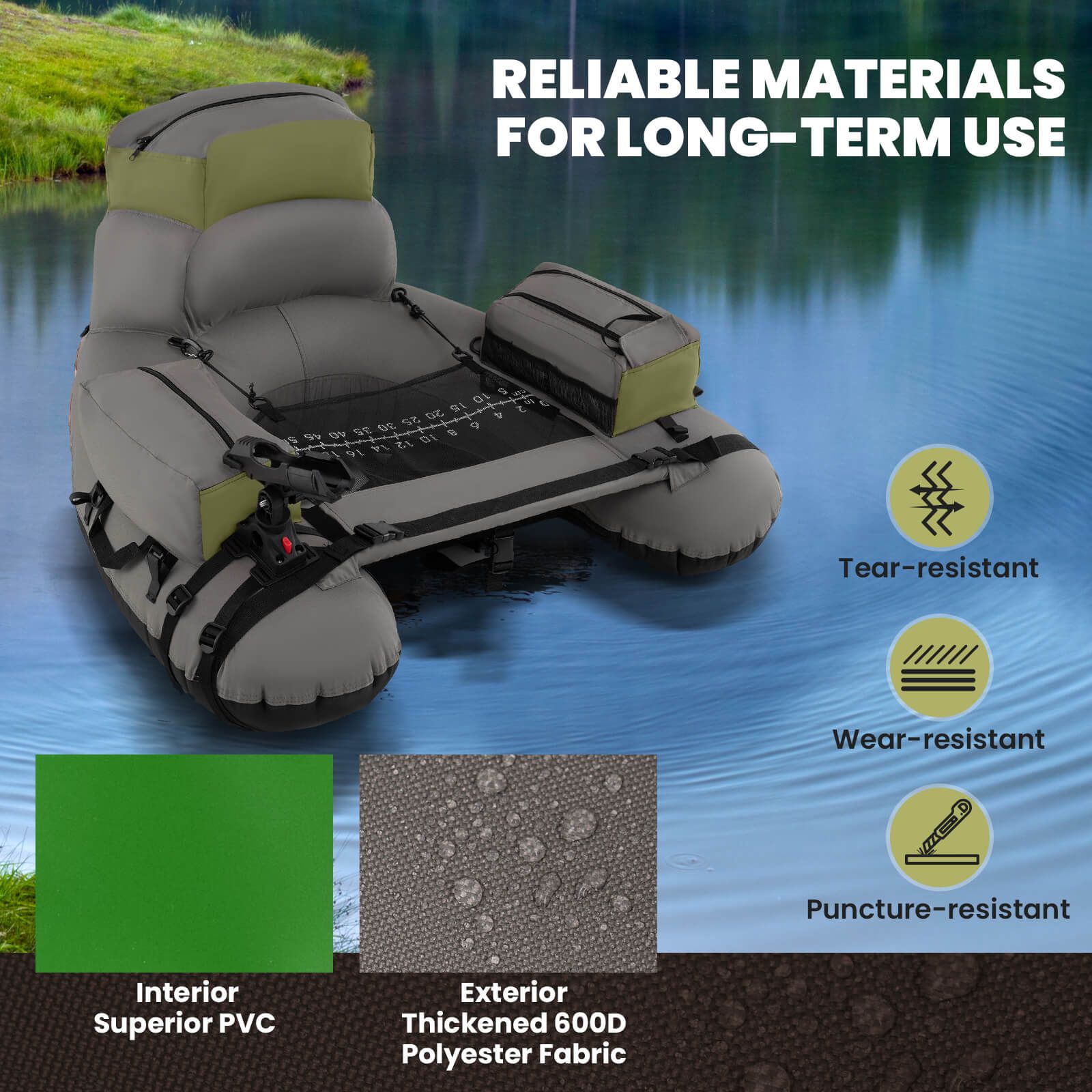 Reliable Materials for Long-Term Use: Constructed with high-quality PVC for the inner chambers and reinforced with thick 600D polyester on the exterior, this fishing boat ensures durability and resistance against punctures and abrasions, ensuring long-term use in various aquatic environments.