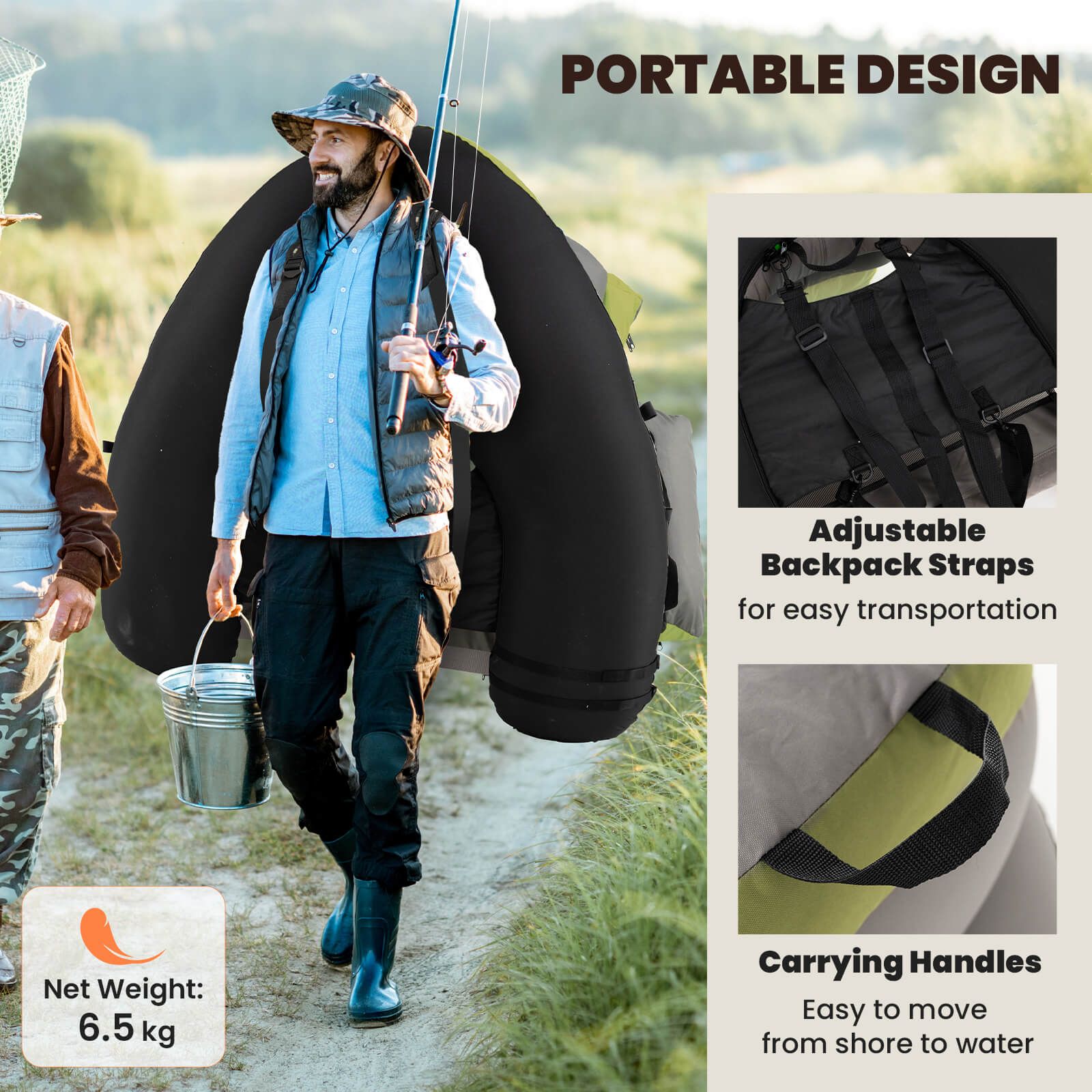 Portable Design: This lightweight float tube is fitted with adjustable backpack straps, only weighing 6.5 kg, allowing for easy transportation, and carrying handles, making it easy to move from shore to water. It's designed to function seamlessly on lakes, rivers, and sea surfaces.