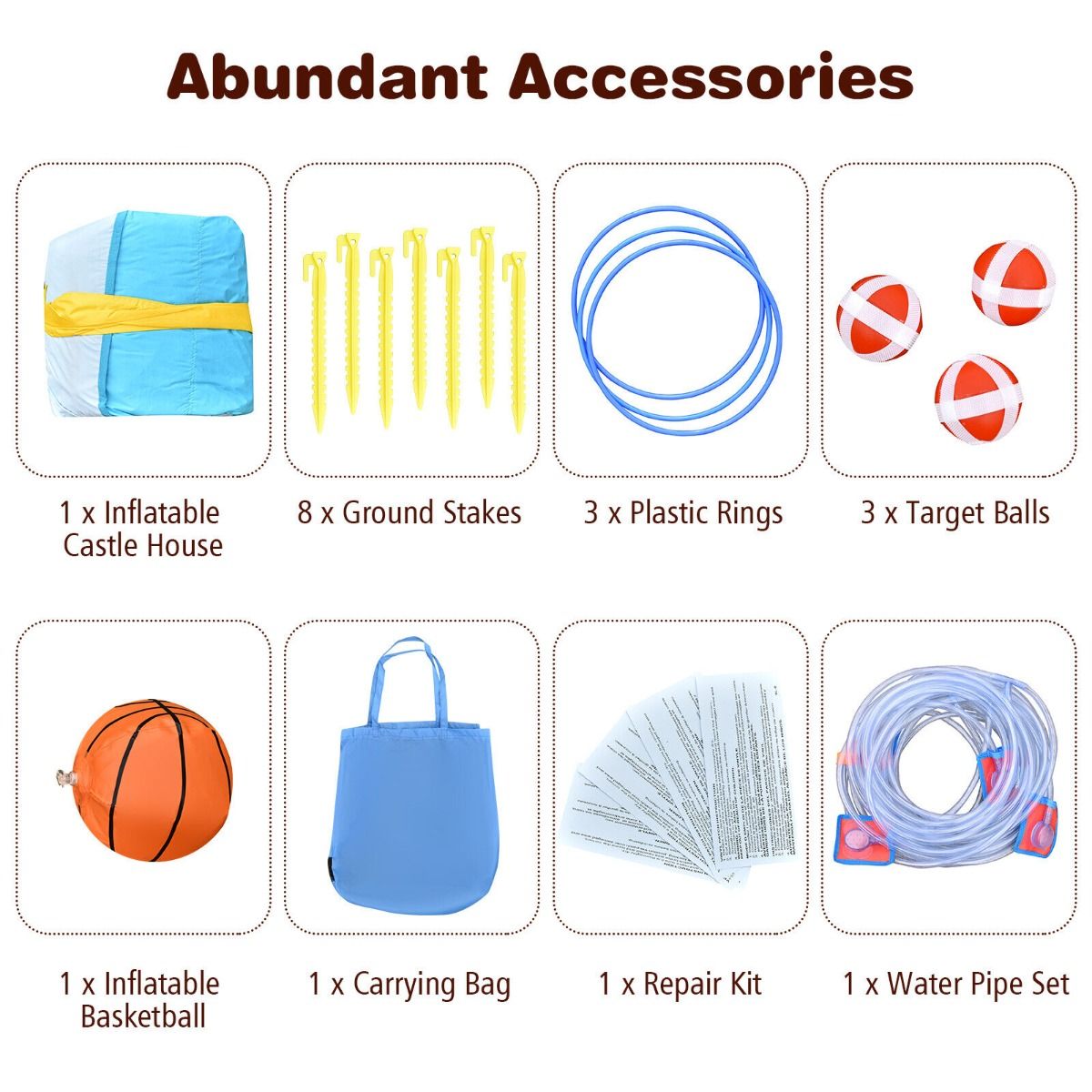 This inflatable water bounce house with bright colours and funny games will be the talk of all the kids! The design of this bouncy castle features the most attractive games for children, such as: a bounce area, a basketball hoop, a water gun, and two slides, all of which allow children to build friendships with friends. 3 plastic rings, 3 target balls and inflatable basketball will bring more enjoyment to your lovely kids. Made of 420D and 800D Oxford cloth, this inflatable water slide is puncture-resistant and lasting long. The mesh netting wall combines the advantages of maximum ventilation and reliable protection to provide a comfortable and safe entertainment environment. It is worth mentioning that the unique outlet tube is designed to help the basketball deflate within a few minutes. The portable carrying bag allows you to quickly store all accessories to prevent loss.