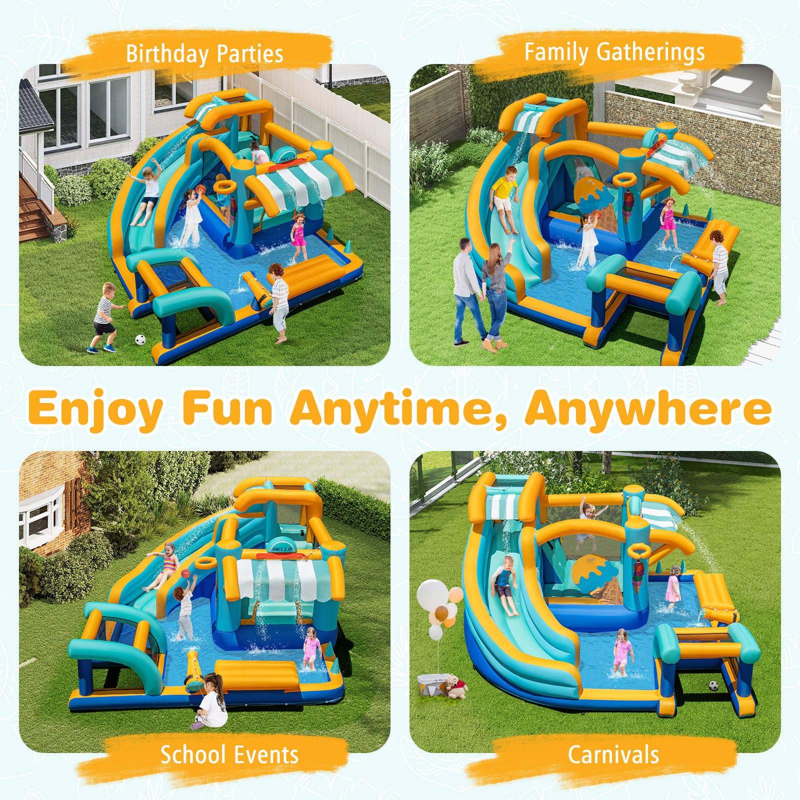Encouraging imaginative play with a market stand design, this interactive setup includes a snack counter and a variety of activities like a bounce area, water slide, splash pool, climbing wall, ring toss game, water cannon, basketball rim, and football goal. High-strength Oxford material provides optimal longevity. Safety is ensured with mesh walls and elevated handrails. It is effortless to set up the bouncy castle using the blower (not included) and ground stakes. Also, it comes with a carrying bag for easy portability and repair kit to fix accidental scratches. The inflatable water slide with market stand is ideal for birthday parties and family gatherings, accommodating up to 5 kids.