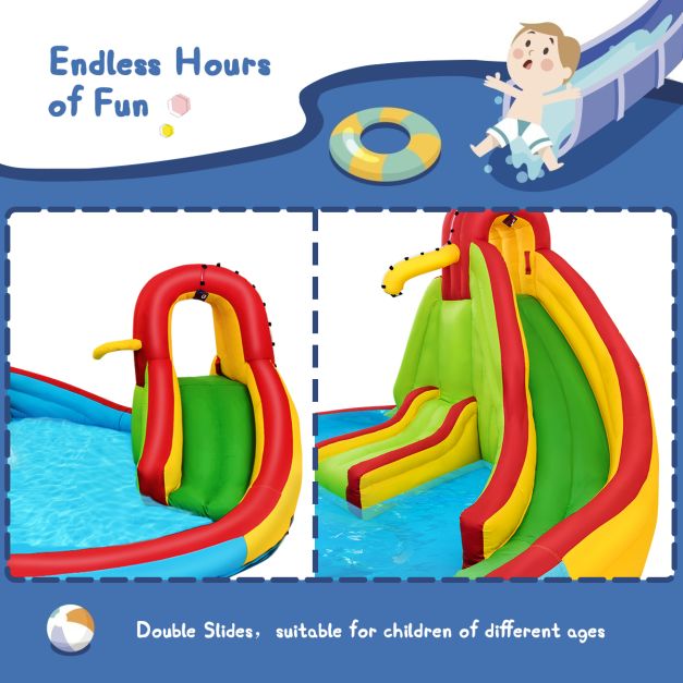 Enjoy Water Fun: Just connect the water hose then it can turn to be an integrated water park. Sliding down the smooth water slides, spraying your friends with water cannon or enjoy the shower on the lounger, this inflatable water park will definitely bring your children the most unforgettable memory this summer.