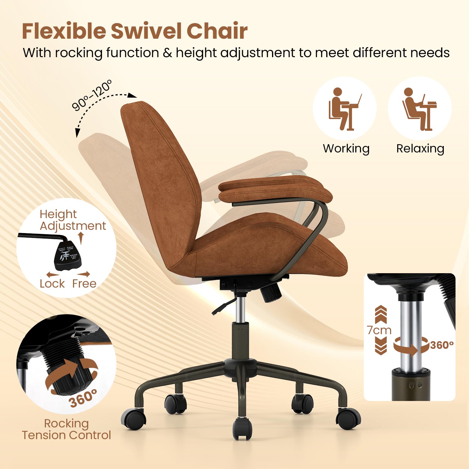Luxurious Feel: Wrapped in suede fabric with exquisite stitching, this office chair is a statement piece with a fine and rich texture that exudes luxury. The high-density sponge padding ensures optimum comfort, making every moment in this chair a delightful experience.