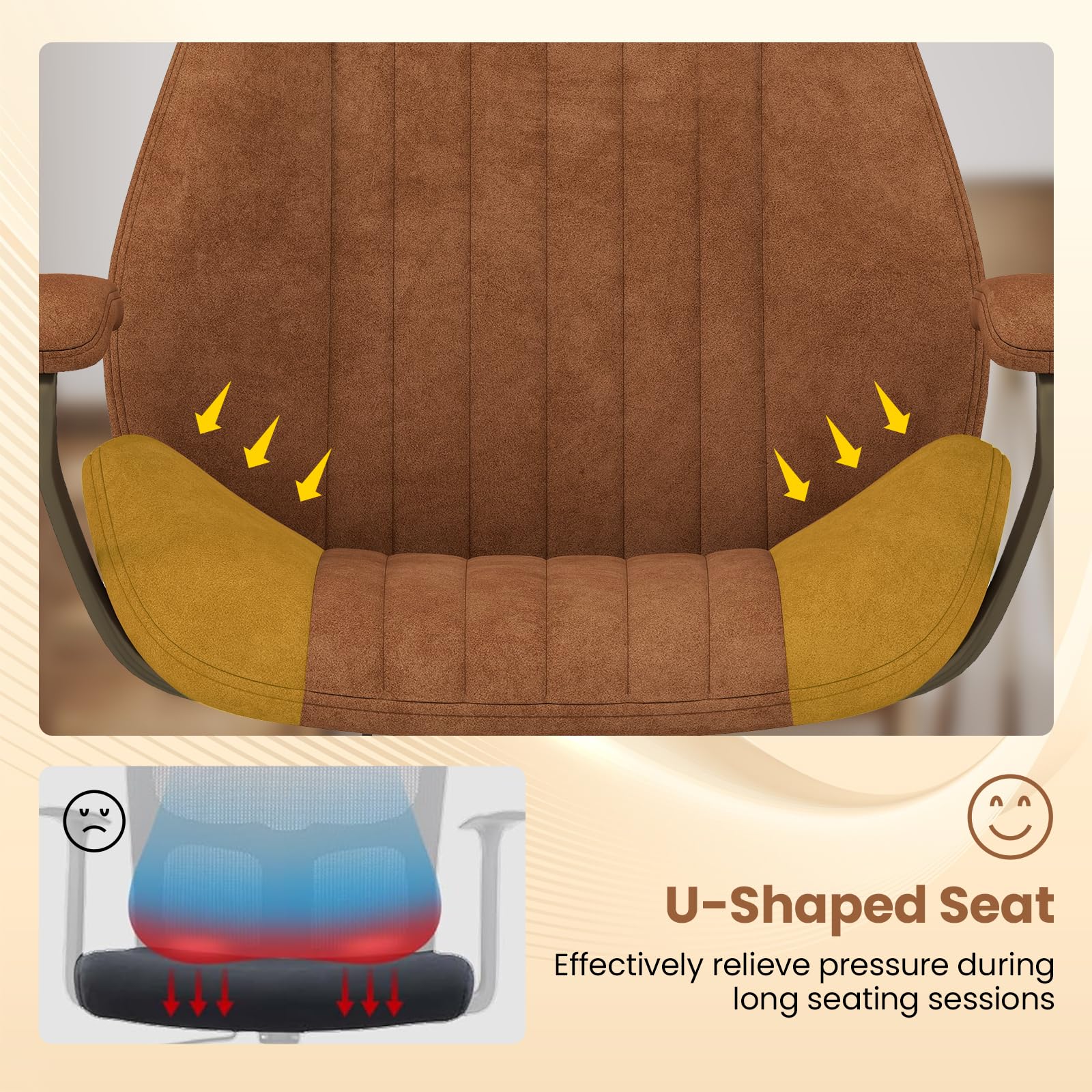 Ergonomic Bliss: The streamlined shaped back of the upholstered desk chair cradles your body like a custom fit, providing unparalleled support. The wide U-shaped seat works wonders in relieving pressure, while the soft-padded armrests make long hours at your desk feel like a breeze.