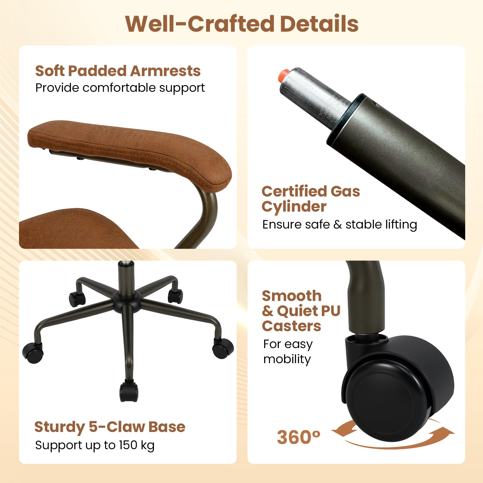 Solid Support: The executive chair with a 5-claw metal base is built to handle up to 150 kg. The certified gas cylinder ensures safe and smooth lifting, while the 5 PU casters let you glide around with ease and low noise, making mobility a breeze.