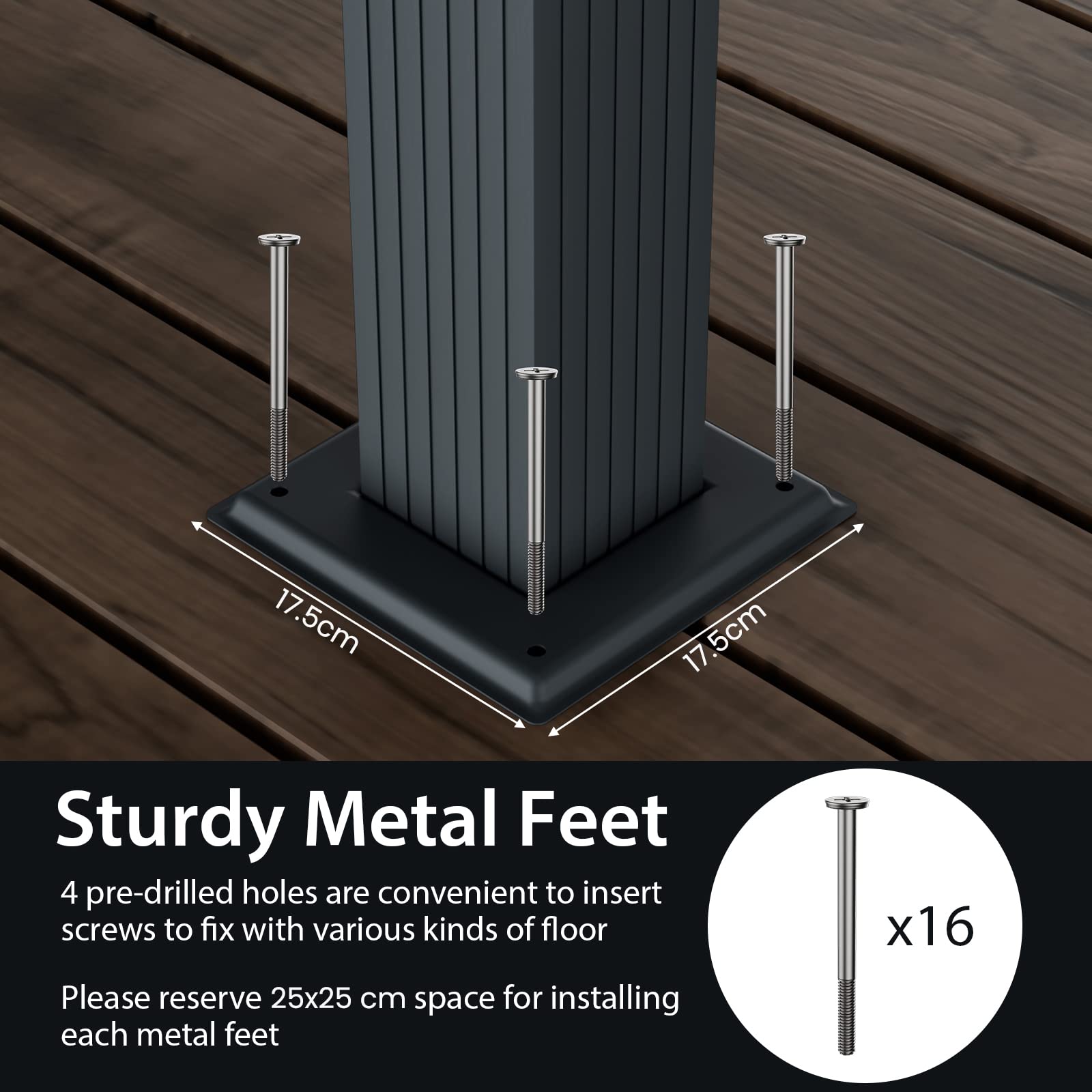 Sturdy Aluminum Frame: Crafted from powder coated aluminum frame, which is firmly connected by multiple fixing screws, the retractable pergola is extremely strong and rust-resistant. And the 4 wide 17.5 x 17.5 cm metal feet with pre-drilled holes can help the pergola stand stably on different ground surfaces(including concrete). Please reserve 25 x 25 cm space for installing each metal foot.
