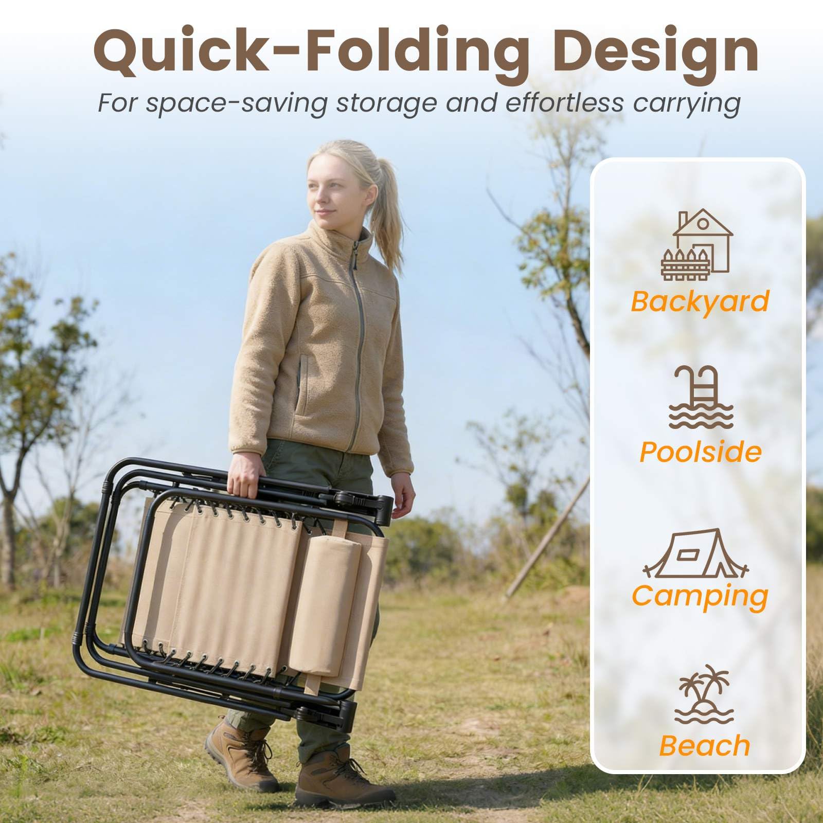 Easy to Store & Transport: With folding design, the patio reclining chair can be folded easily, so that you can place it in a corner or store it in the trunk. These compact zero gravity chairs are suitable for various occasions, such as patio, poolside, beach, balcony, living room, etc.
