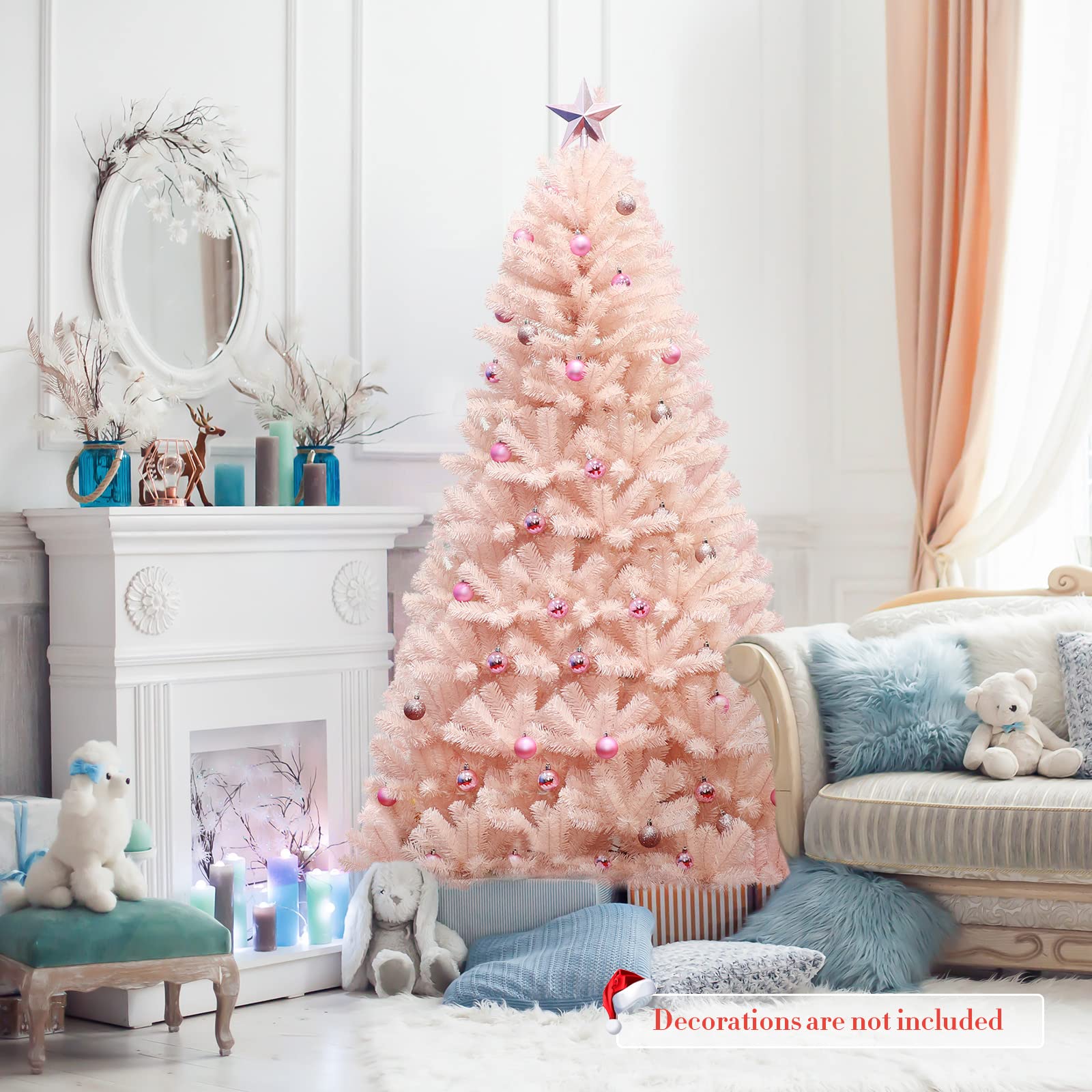 Our unique pink tree with eye-catching look will stand out in the general green tree to give your enchanting smell of holiday encompassing indoors and outdoors. Great for home, office, shops, apartments and more. Environment-friendly PVC material and stable metal stand provides you quality long-term life during several seasons. Without time-wasting and tired assembly, 3 hinged design surely save you lots of time and energy. Especially 617/937 dense branch tips help this Christmas tree emulate a full-bodied genuine pine tree. There is ample decorative space for your imagination and creativity without extra decorations.