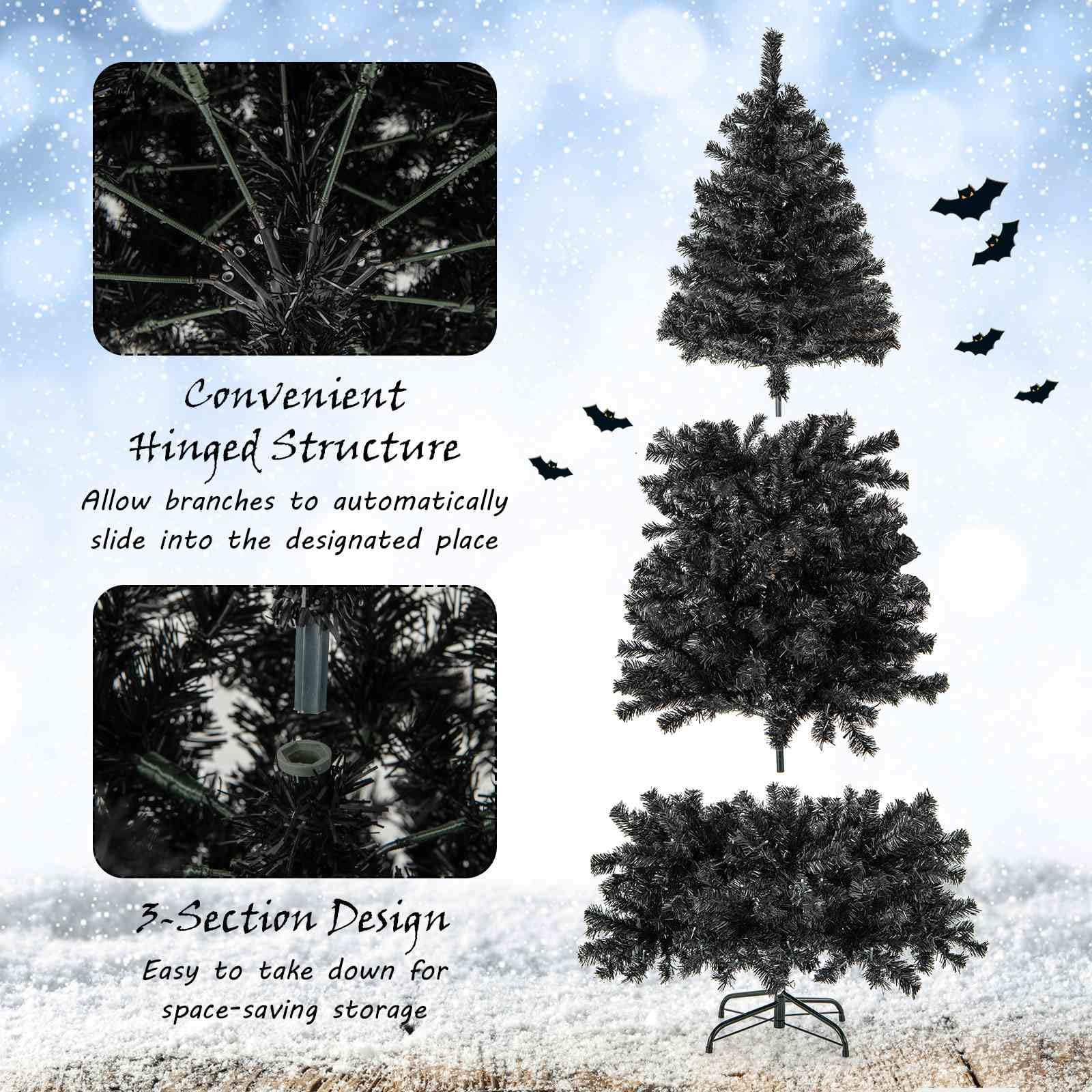 This unique black Christmas Halloween tree features a flexible adjustable top section inspired by a wizard hat shape, allowing you to customize its appearance by bending and tilting the branches in various directions. With 726/1050 dense branch tips made from distinctive black leaves and adorned with 260/340 warm white LED lights, this tree creates a striking visual display. The faux leaves are crafted from flame-retardant PVC, and the tree is supported by a sturdy crossed metal base, ensuring safe and long-lasting use. Thanks to its hinged structure and 3-section design, assembling the tree is easier than ever. Whether enhancing the spooky allure of Halloween parties or adding a touch of holiday cheer to Christmas gatherings, this pre-lit artificial tree is sure to be a standout piece in your seasonal decoration collection.