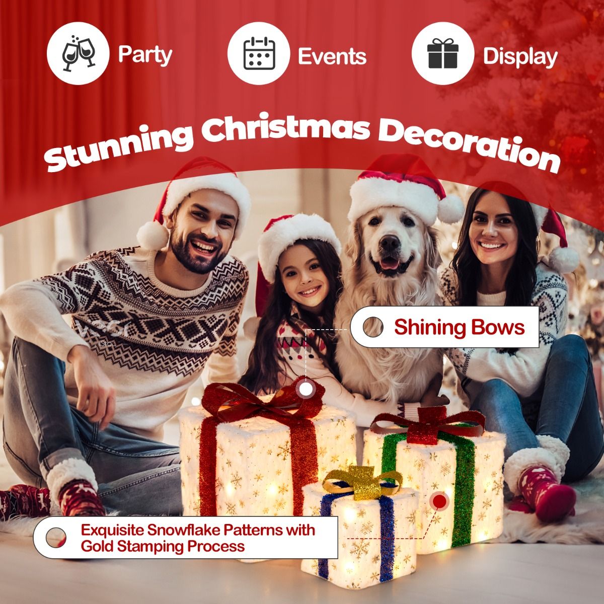 Set of 3 Christmas Lighted Gift Boxes: This Christmas decoration includes a 15cm small gift box, a 20cm medium gift box and a 25cm large gift box. Each box is decorated with shining bows and exquisite snowflake patterns with gold stamping process, bring your family endless surprises and joy.
