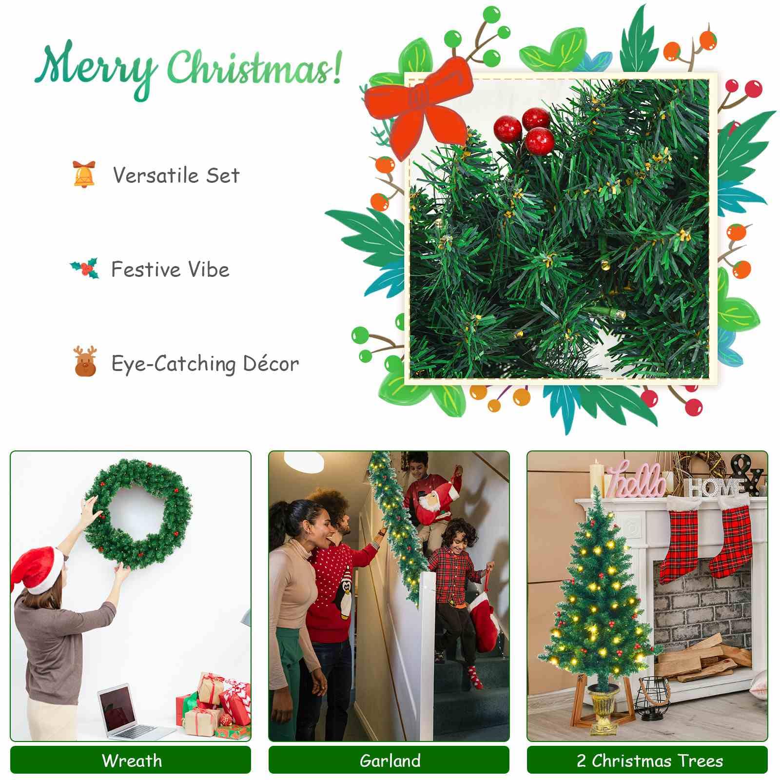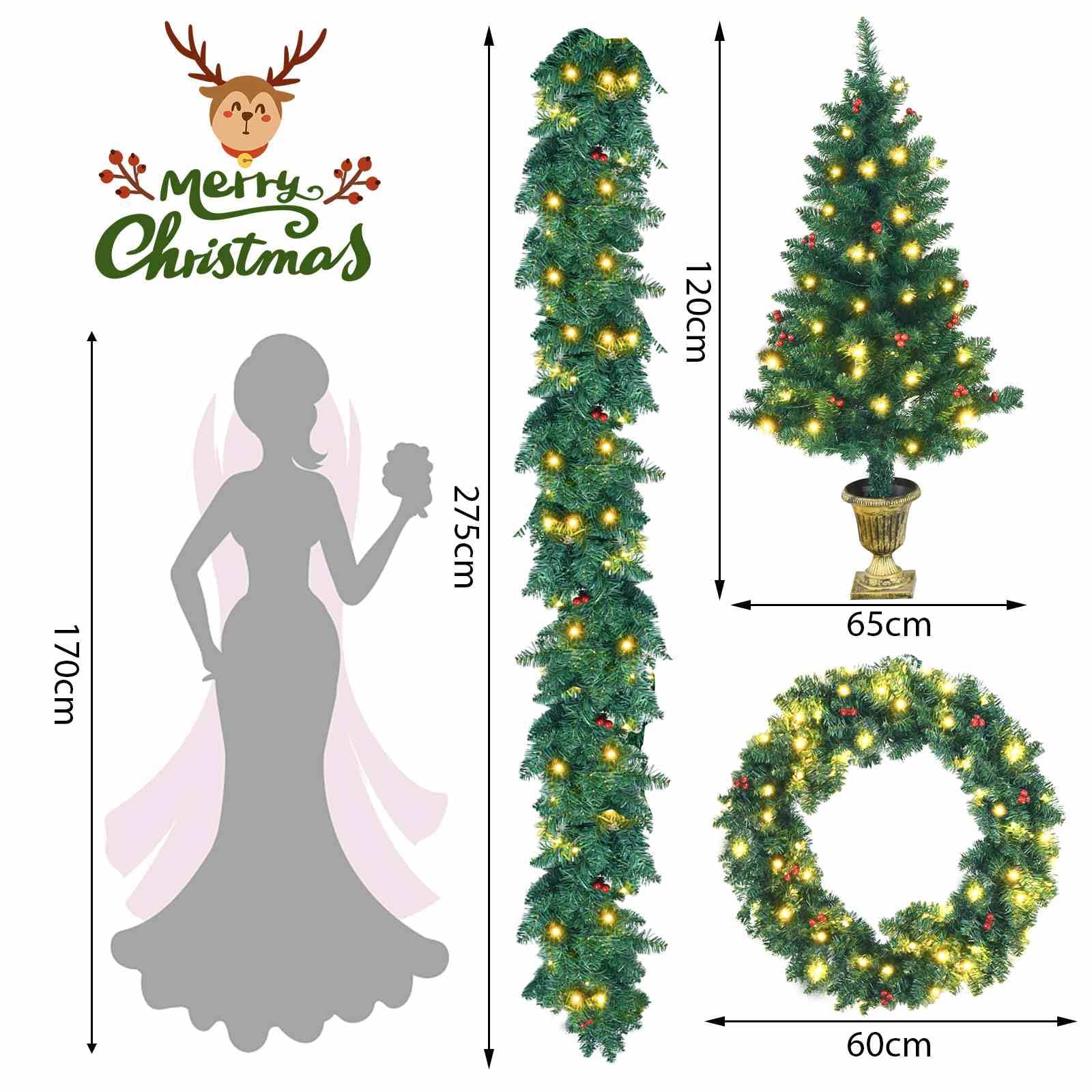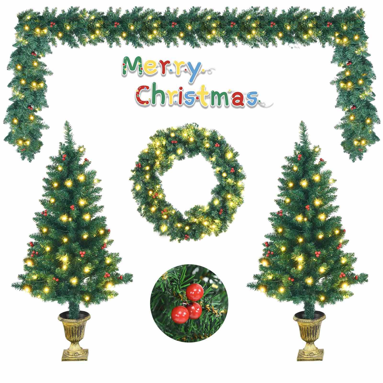 Pre-Lit Holiday Christmas 4-Piece Set with 200 LED Lights and Red Berries