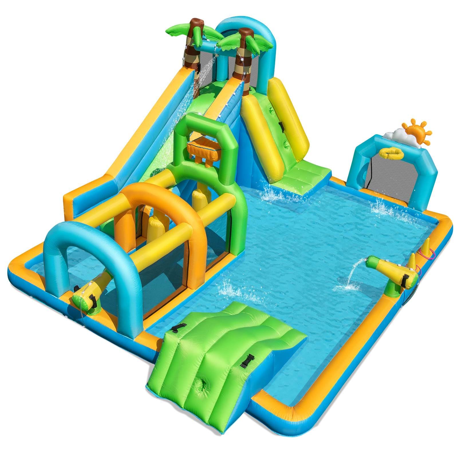 Thrill-Seekers Unite: Get ready for the exciting water adventure with the inflatable water slide! It features a towering palm tree water slide, a challenging climbing wall, a small ramp, a sunshine basketball and football goal, a thrilling obstacle tunnel with a downpour, 2 water cannons, and a ring-toss game – endless fun for active kids!